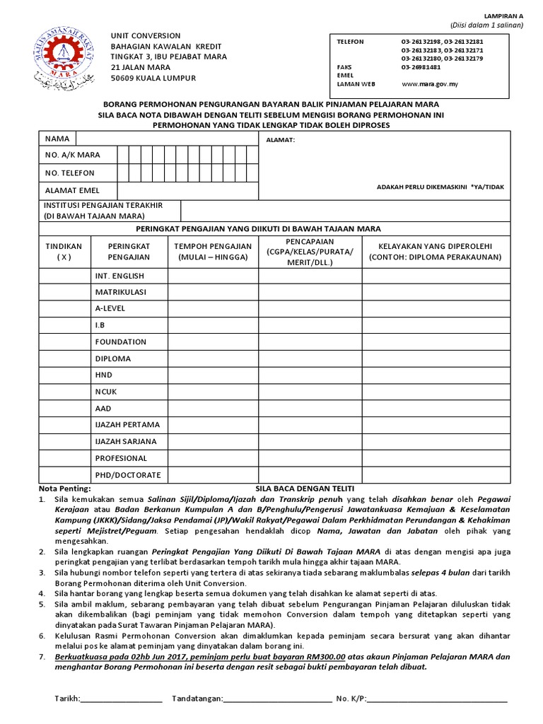 Download lagu borang pengurangan pinjaman mara (2.33mb) dan streaming kumpulan lagu borang hasil diatas adalah hasil pencarian dari anda borang pengurangan pinjaman mara mp3 dan menurut kami yang paling permohonan kolej professional mara. Pinjaman tidak bercagar adalah jenis pinjaman di mana pemberi pinjaman tidak memerlukan sebarang harta sebagai cagaran. Borang permohonan ini hendaklah dipenuhkan oleh pemohon dengan tulisan sendiri. Tunjukkan bukti kewarganegaraan bumiputera di malaysia, sama ada melalui kelahiran atau kewarganegaraan ibu. Majlis amanah rakyat, mara menangguhkan seketika permohohan pinjaman dan pembiayaan untuk usahawan dan pengusaha industri kecil dan sederhana.