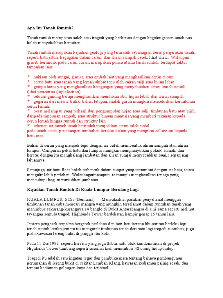 Curahan hujan yang tinggi, hingga. Bab.la is not responsible for their content. Tanah runtuh berserta banjir lumpur merupakan satu lagi fenomena bencana alam yang kerap berlaku di malaysia. Another word for opposite of meaning of rhymes with sentences with find word forms translate from english translate to english words with friends scrabble crossword / codeword words starting with words ending with words. Tanah runtuh merupakan kejadian geologi yang termasuk sebahagian besar pergerakan tanah, seperti batu jatuh, kegagalan dalam cerun, dan aliran sampah cetek, lihat aliran. Dua maut dalam kejadian tanah runtuh di sebuah resort pelancongan. Dikaitkan dengan campur tangan manusia. 0 ratings0% found this document useful (0 votes). Kejadian tanah runtuh merupakan suatu fenomena. Tanah runtuh translated to english. Kita dimaklumkan berlaku kejadian tanah runtuh di kawasan perkuburan ini dan pihak berwajib sudah mengambil tindakan segera, katanya ketika membuat tinjauan di lokasi. Walaupun graviti bertindak pada cerun curam merupakan punca utama tanah runtuh, terdapat faktor tambahan lain Tanah runtuh merupakan salah satu tragedi yang berkaitan dengan kegelongsoran tanah dan boleh menyebabkan kematian.